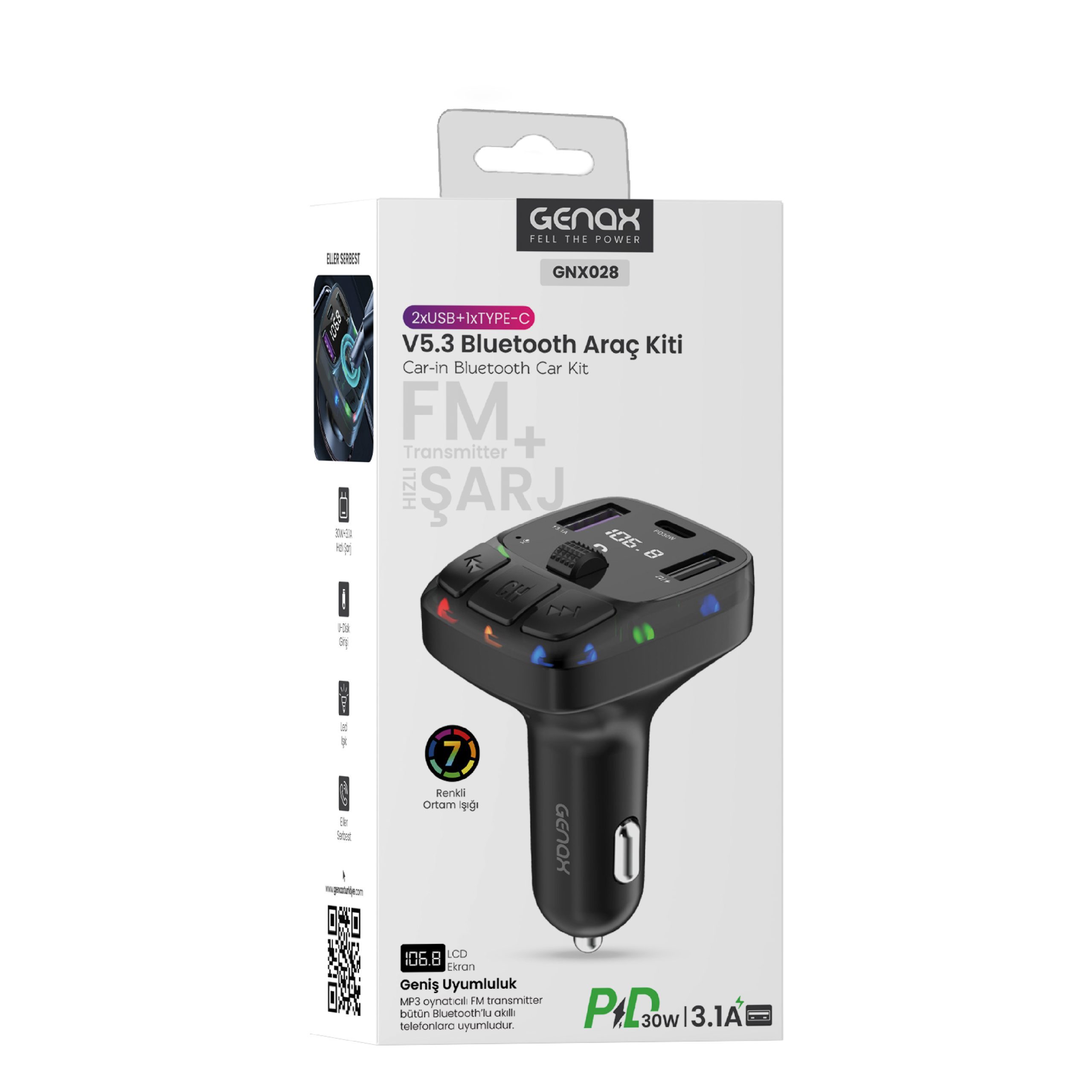 Genax GNX028 V5.3 Bluetooth FM Transmitter Araç Kiti – 2xUSB + 1xType‑C | 30W PD Hızlı Şarj Destekli