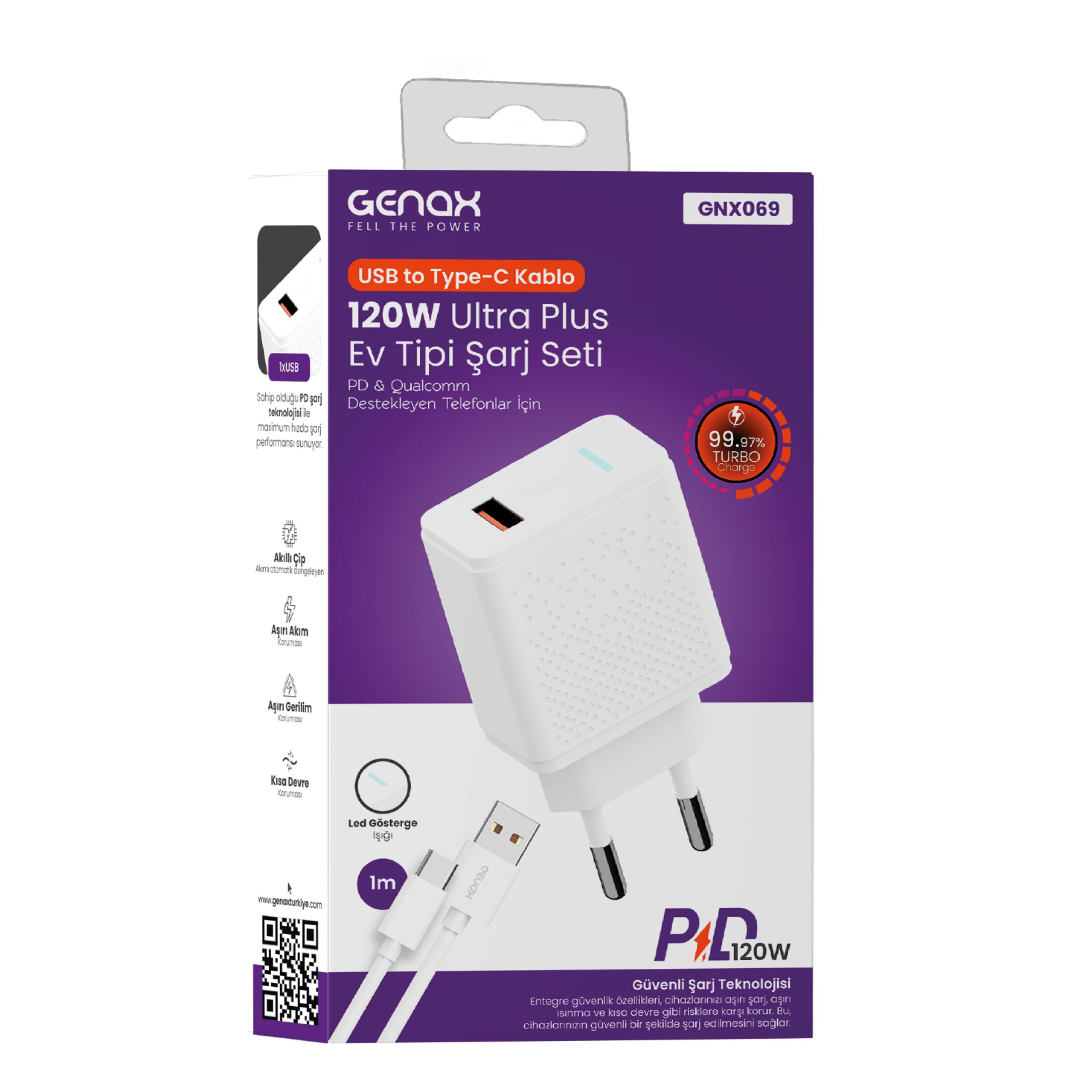 Genax GNX069 120W Ultra Plus Ev Tipi Hızlı Şarj Seti (USB to Type‑C Kablo Dahil)