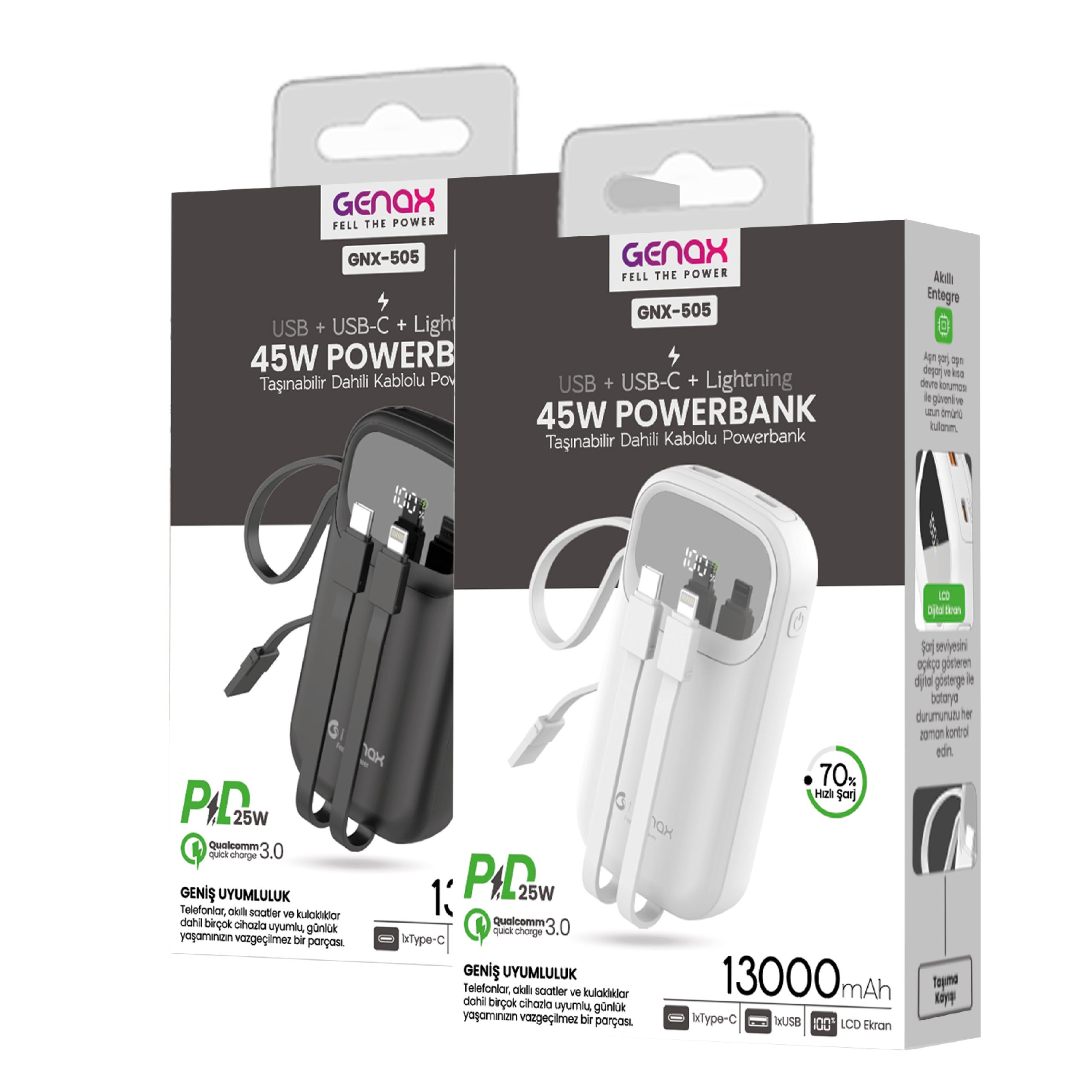 | Çıkışlar | USB-A + Type‑C + Lightning (dahili kablolu) |